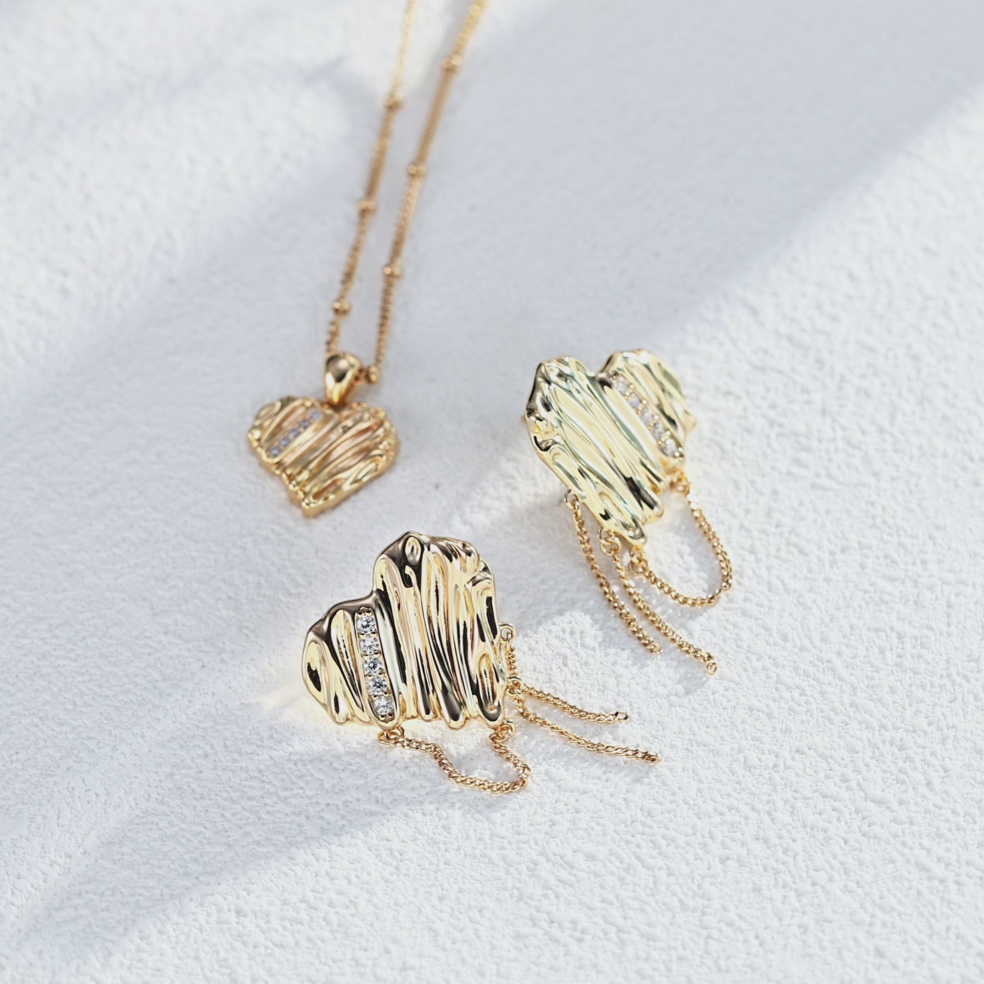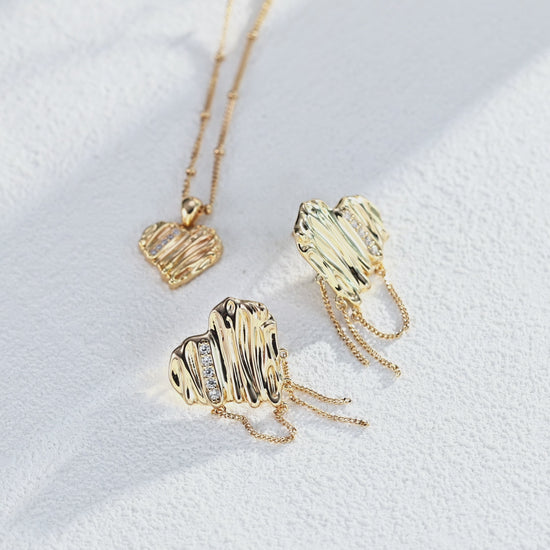 Bold, edgy, and effortlessly cool — the Silver/ Gold Molten Chain Earrings feature an abstract molten-metal shape with fine chain tassels and sparkling cubic zirconia inlays. This sculptural design adds a contemporary, artful twist to any outfit. Perfect for those who love a touch of rebellion in their elegance.